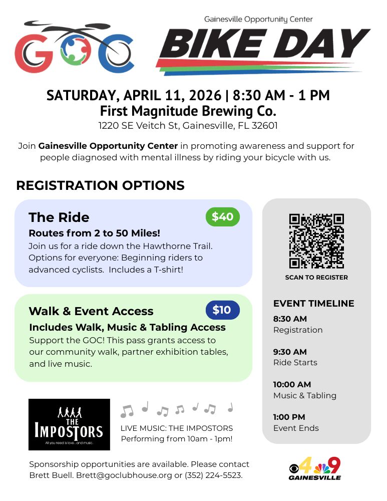If you would like to make a donation to sponsor our Bike Day event, you can mail a check payable to Gainesville Opportunity Center, 1210 NW 14th Ave, Gainesville, FL 32601 (note in the check’s memo field that it is for sponsorship) or click this link to donate electronically.