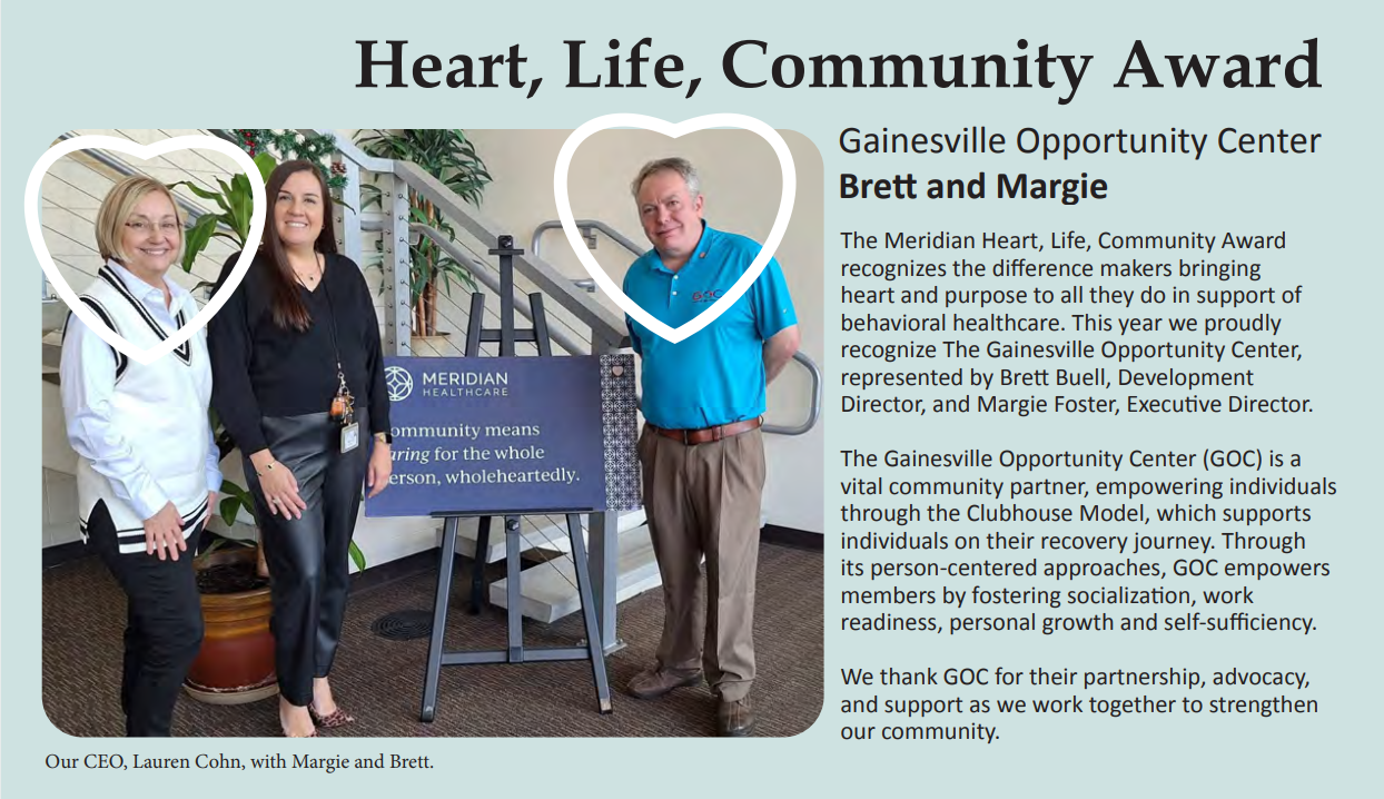 Thank you, Meridian Healthcare, for this incredible honor and for your partnership in strengthening our community. Lutheran Services FloridaClubhouse International – ICCDFlorida Department of Children and Families