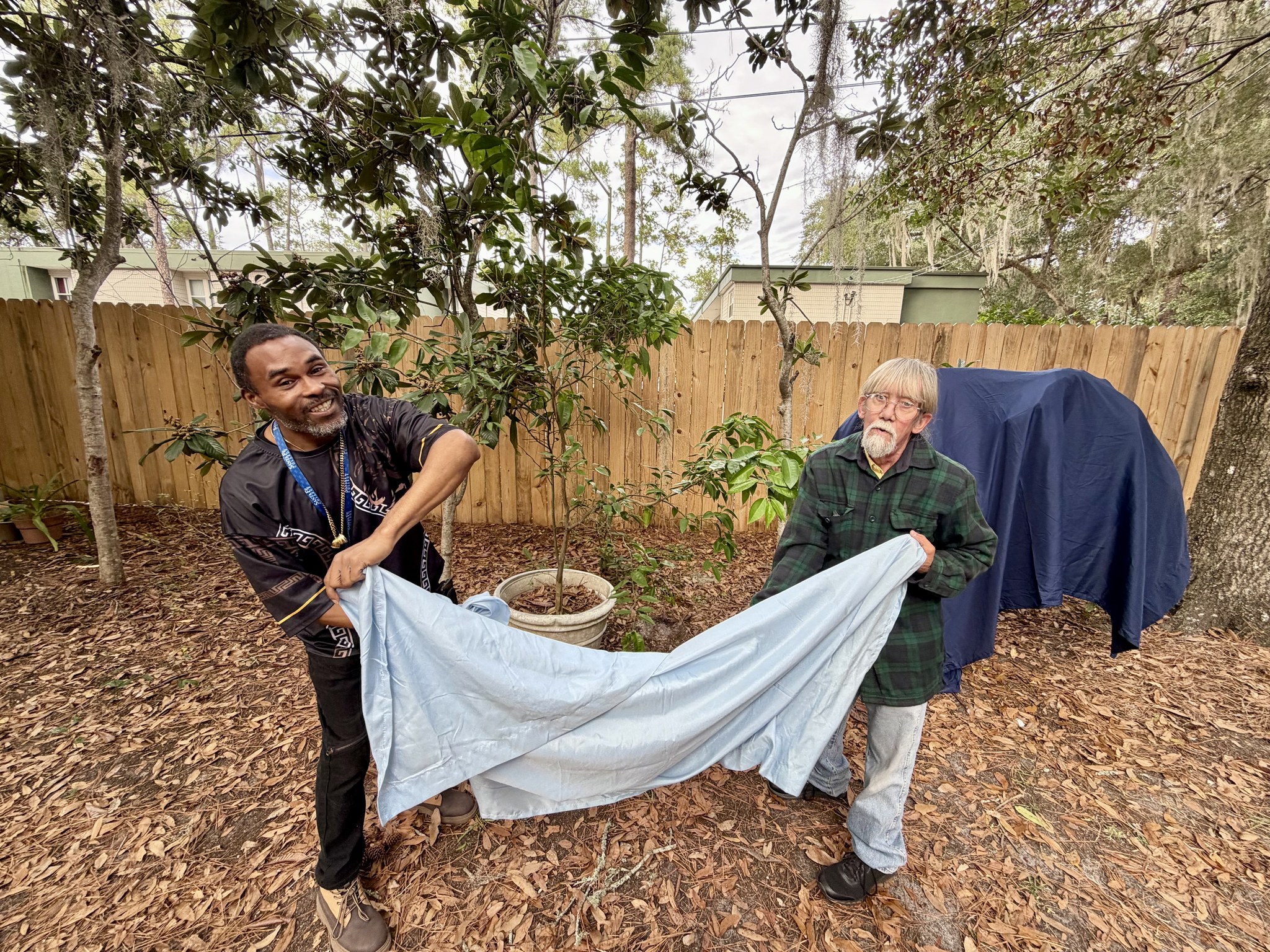 Akeem and Scott take leadership in our Garden. If you think it is hard to get your sheets onto the bed, try putting them over a citrus tree. What a team effort!